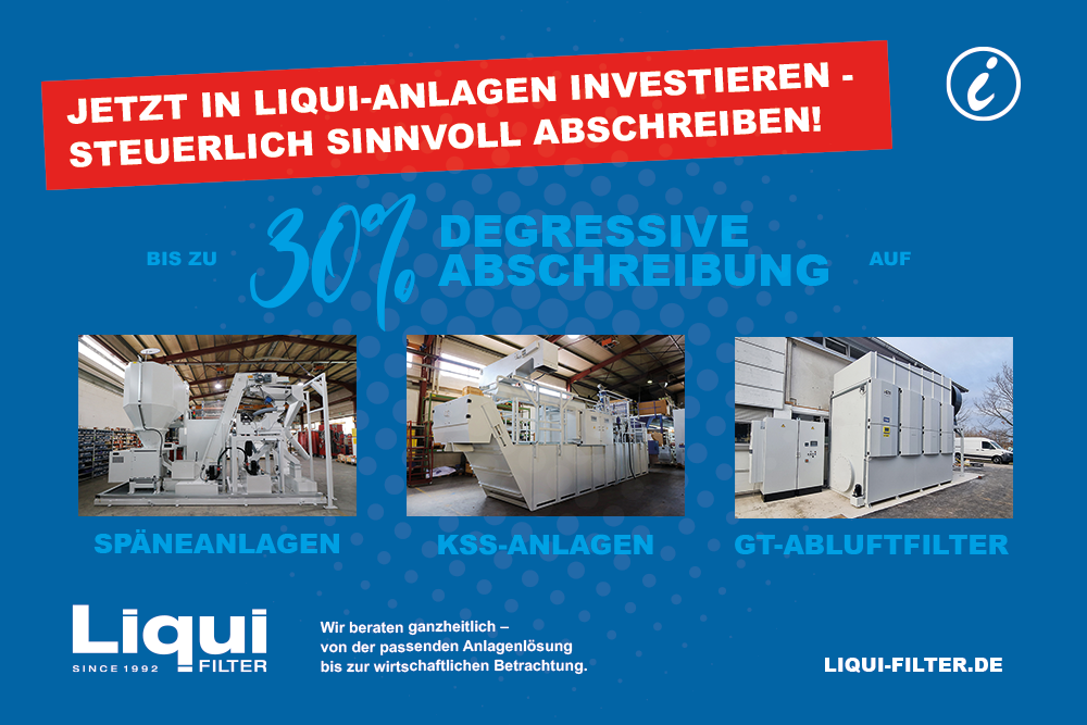 Für bewegliche Wirtschaftsgüter gilt aktuell die degressive Abschreibung von bis zu 30 %. Das betrifft GT-Abluftfilter, Späneanlagen und KSS-Anlagen von LIQUI gleichermaßen. ✔ Degressive AfA bis zu 30 %✔ Für